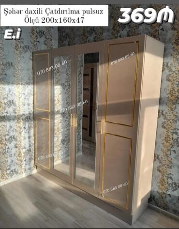 Qara-qızılı dekorlu üçqapılı qarderob - Ön hissədə iki böyük güzgü paneli - Kənarlarda qızılı çərçivələr və dekorativ halqalı tutacaqlar - Orta hissədə açılan iki qapı, yanlarda əlavə bölmələr - Ge...