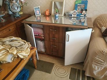 - Material: laminat taxta (ağ və qoz rəng kombinasiya), üst hissə parlaq şüşə/aynabənd panel.