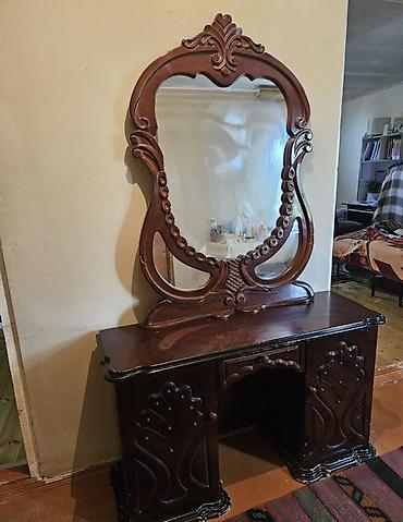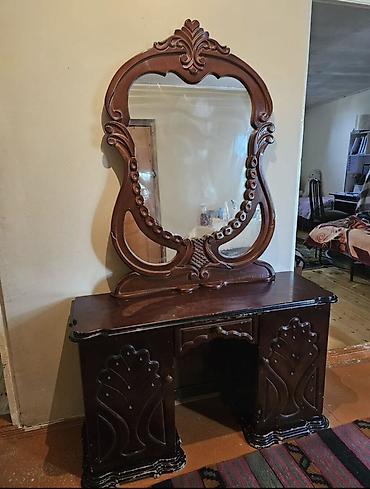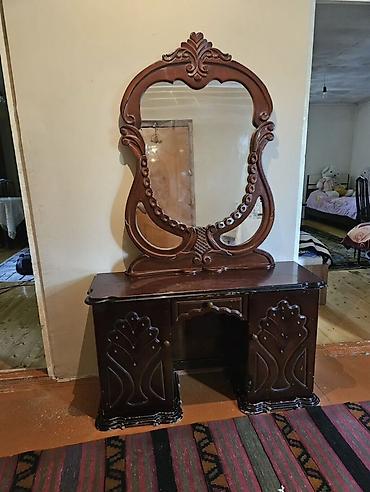 Klassik üslubda güzgülü makiyaj/komod dəsti - Material: ağac əsaslı, laklı tünd qəhvəyi üstlük - Üst hissə: iri dekorativ çərçivəli güzgü, oyma naxışlı başlıq və alt baza - Masa: hamar iş səthi, k...