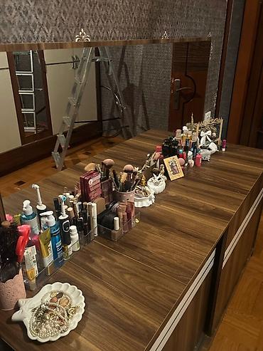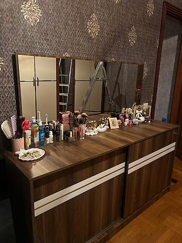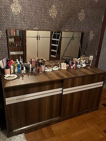 Tualet masası və güzgü ilə komod dəsti - Material: MDF/laminat. - Rəng: tünd qəhvəyi və krem kombinasiya. - Üst hissə: geniş masa səthi – makiyaj, aksesuar və gündəlik istifadə üçün rahat. - Güzgü...