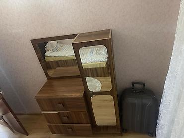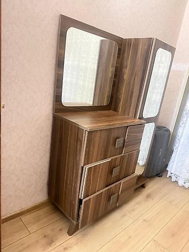 Tualet masası və komod dəsti - Material: taxta/MDF əsaslı, tünd qəhvəyi rəng - Komplekt: böyük güzgü ilə tualet masası üstü və 3 geniş çekmecəli komod korpusu - Güzgü: iri ölçülü, üfüqi yerləşdiri...