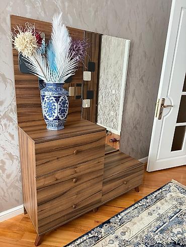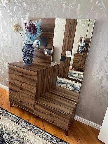 Güzgülü makiyaj masası tumbucka ile birlikde satilir. - Geniş üst səthli, iki rəng kombinasiyalı (açıq taxta və tünd) makiyaj masası - Böyük divar güzgüsü çərçivəli - Sol blokda 3 dərin çekmece, ü...