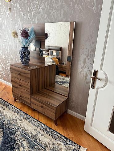 Aynalı konsol/dresuar - Material: ağac naxışlı laminat səth, möhkəm korpus - Üst hissədə iri panoramic güzgü (eninə), çərçivə mebellə eyni teksturada - 4 qapılı şkaf bölməsi: mərkəzdə ikiqat qapı,...