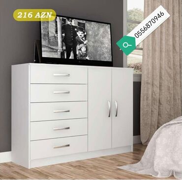 - 6 çekmecəli hündür komod: ağ rəng, yivli (handleless) açılış. Üst səthdə dekor/aksesuar üçün yer.