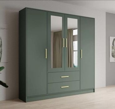 Qısa desək, yüksək funksionallığa malik, güzgülü və çoxbölməli qarderob həlli; ikinci fotoda uyğun şifon yer və tumbə ilə tam dəst kimi təqdim olunur.