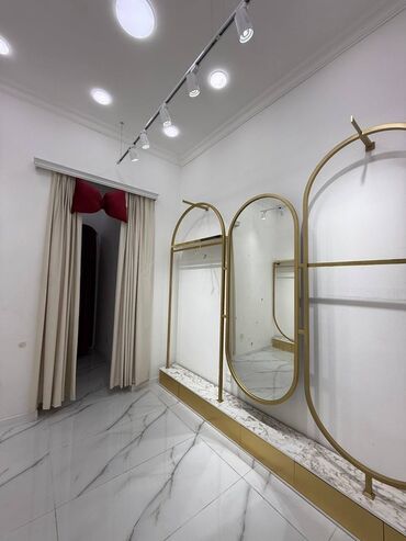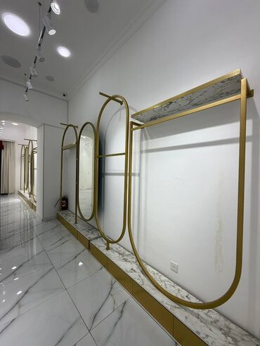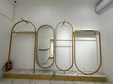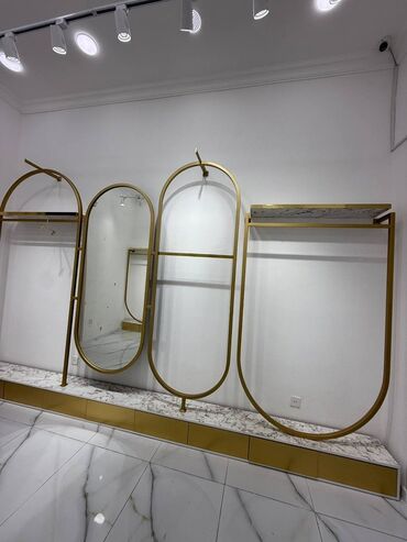 Dörd qızılı metal geyim asılqanları dəsti, iki oval formalı güzgü və iki rəflə birlikdə. Bu dəst butik və ya mağaza üçün geyimləri sərgiləmək üçün idealdır. Asılqanlar qızılı rəngdədir və müxtəlif geyim əşyalarını səliqəli şəkildə nümayiş etdirmək üçün nəzərdə tutulmuşdur. Oval formalı güzgülər müştərilərə geyimləri sınamaq imkanı verir, rəflər isə əlavə aksesuarlar və ya qatlanmış əşyalar üçün istifadə edilə bilər. Dəst müasir və zərif görünüşə malikdir, ağ divar fonunda və mərmər naxışlı döşəmə ilə tamamlanır. Mağazanın interyerinə uyğun dizaynı ilə bu dəst həm funksional, həm də estetik bir seçimdir.
