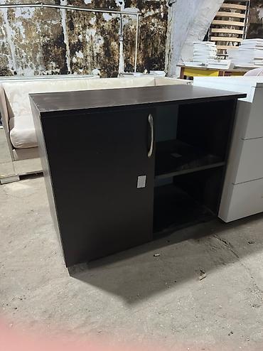 - Komod (tünd rəng): Yan hissədə qapılı bölmə, digər tərəfdə 2 açıq rəf. Üst səthdə əlavə yerləşdirmə imkanı. Metal tutacaqla praktik açılış. Ofis, qonaq otağı və ya dəhliz üçün uyğundur.