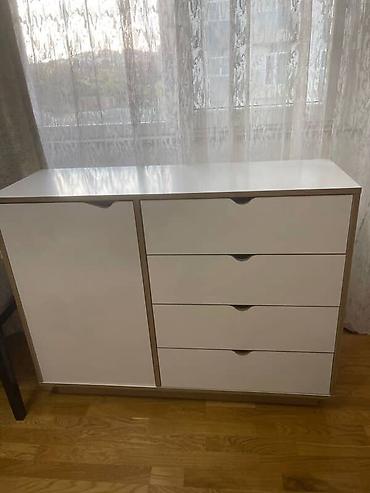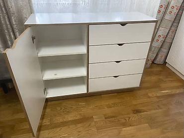 Ağ rəngdə kompakt komod/dolab: - 4 ədəd çəkmece + 1 qapılı bölmə - Sadə, minimal dizayn, qara düymə tutacaqlar - Üst hissə dekor və gündəlik əşyalar üçün genişdir - Yataq otağı, qonaq otağı və dəhl...