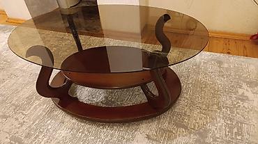 Şüşə üstlü salon masası - Forma: oval - Üst hissə: qalın temperli şüşə, tünd rəngli (smoky) effekt - Çərçivə və ayaqlar: xrom rəngli metal borular - Ayaq ucları: rezin qoruyucular – sürüşmənin və ...