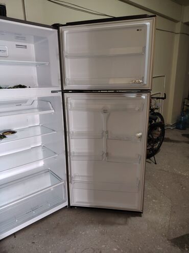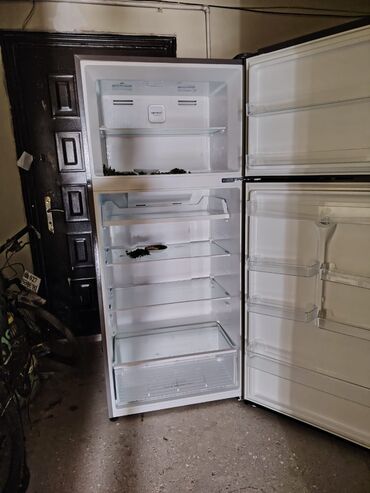 - Aşağıda əsas soyuducu kamera: çoxsaylı möhkəm şüşə rəflər, geniş tərəvəz/mevə çekmesi (Fresh & Humidity Crisper yazılı), qapı üzərində bir neçə balaca və böyük rəf