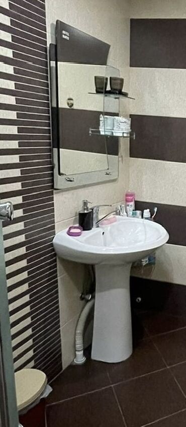 Hamam-tualet mebeli və sanitariya dəsti - Asma güzgülü şkaf: geniş güzgü, üst hissədə dekorativ panellı qapalı bölmə, iki açıq rəf və gizli bölmə; gündəlik gigiyena vasitələri üçün rahat yerleşim....