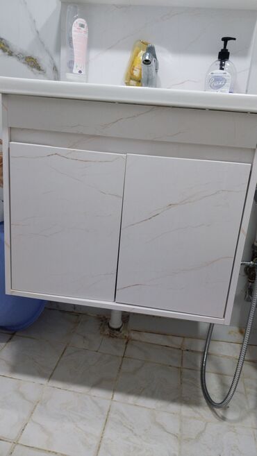 - Dolab: Divardan asma konstruksiya; iki qapılı, hamar səthli fasad. Açıq krem-ağ rəngdə mərmər naxışlı dekor. Alt hissə santexnika üçün yer buraxır.