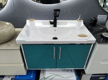- Rəng və tekstura: ağ lavabo + firuzə ön panel, xrom detallar, qara kranla kontrastlı görünüş