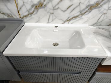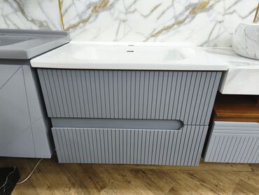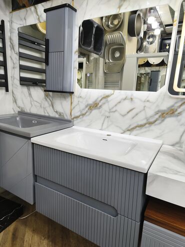 Hamam və sanitar avadanlıqları komplekti - Asma hamam mebeli: iki ədəd müasir dizaynlı, boz rəngli şkaf modulu, üstü mərmər teksturalı stolüstü ilə. - İki ədəd qabdaqrafik (üstüqoyma) əl üzüyü: bi...
