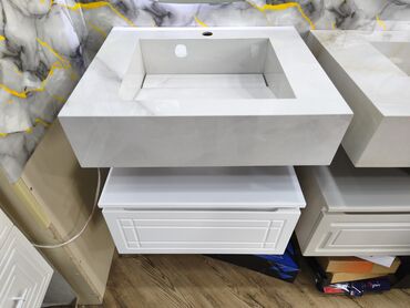 - Material: cilalanmış daş/daş-kompozit üst hissə, monolit kvadrat formalı qab; aşağıda laklı ağ MDF çekmecəli modullu şkaf