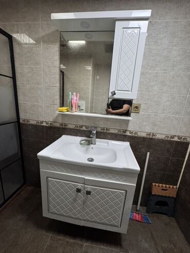 - Komplektə daxil görünənlər: lavabo, kran, alt dolab, üst güzgülü şkaflı panel, üst paneldə işıq yerləri.