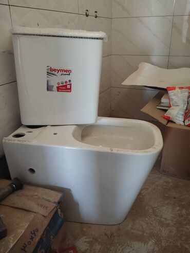 - Unitaz: döşəməyə quraşdırılan model, üst sisternalı. Sisternada “Beymen Seramik” loqosu var və üzərində “15 years guarantee” qeydi görünür. Üst hissə qoruyucu plyonka/bubble ilə örtülüdür. Yan tərəfdə giriş/çıxış üçün hazır texniki dəliklər var. Klassik ağ keramika, yumru xətli dizayn.