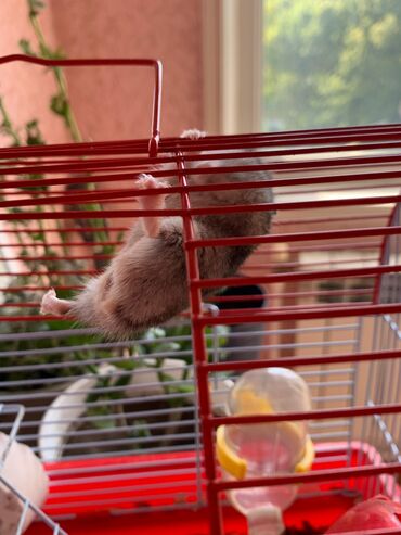 Hamster və tam set qəfəs - Növ: cırtdan hamster (ağ rəngli)4 eded - Qəfəs: metal barmaqlı, qırmızı rəngdə, üstü tağvari. Qapılı giriş, sabit plastik altlıq. - Aksesuarlar: içməli su üçün şüşə butu...