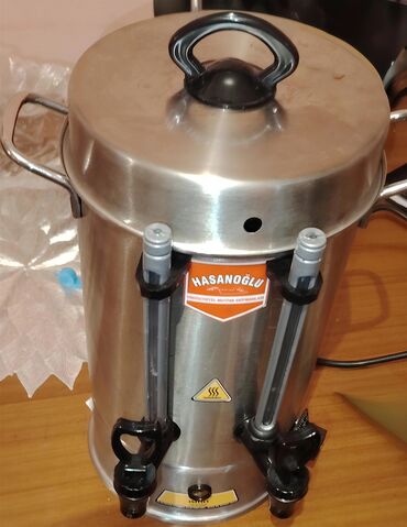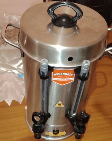 Hasanoğlu sənaye tipli samovar/çay dəmləyən aparat - Paslanmayan poladdan (inox) gövdə və qapaq - İkili su səviyyə göstəricisi (şəffaf borularla) - Aşağı hissədə elektriklə isitmə üçün rezistor bö...