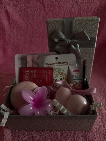 Gözəllik və özünəqayğı üçün toplanmış set: üz maskaları, nəmləndirici kremlər, dodaq baxımı, makiyaj üçün qələm və gündəlik istifadə üçün kompakt güzgü. Estetik hədiyyə qutusu hazır bəzəkli görünüşü ilə xüsusi günlər və sürprizlər üçün uyğundur.