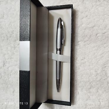- Zərif qara hədiyyə qutusunda metal korpuslu, gümüşü rəngli qələm