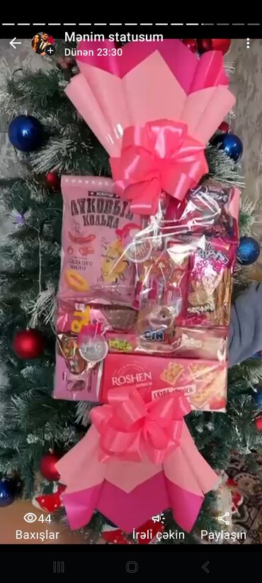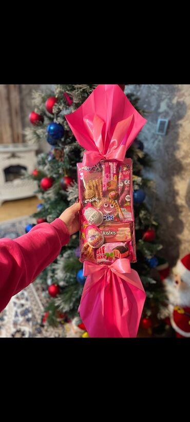 Sifarisle isteye uygun.Zövqe uygun yigilir.Hədiyyəlik şirniyyat bağlaması – tematik “konfet” üslubunda, parlaq çəhrayı hədiyyə kağızı və iri lentlə bəzədilmiş.
