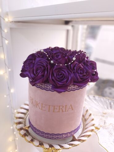 - Bənövşəyi güllər üçün məxməri toxumalı açıq çəhrayı qutu, “BUKETERIA” yazısı və bənövşəyi bəzəklər