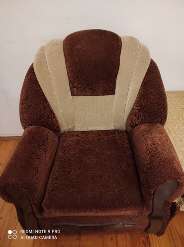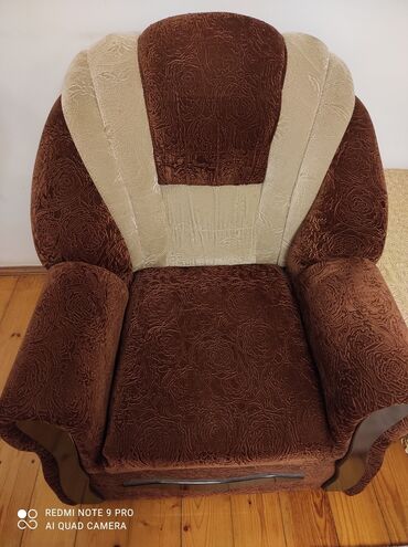 Mebel: Yumşaq kreslo - Rəng: qəhvəyi və bej iki rəngli dizayn - Material: yumşaq toxumalı parça üzlük, dolğun süngər oturacaq və bel hissə - Forma: geniş oturacaq, iri qol dayaqları, yanlardan bej...Giriş•Qeydiyyat