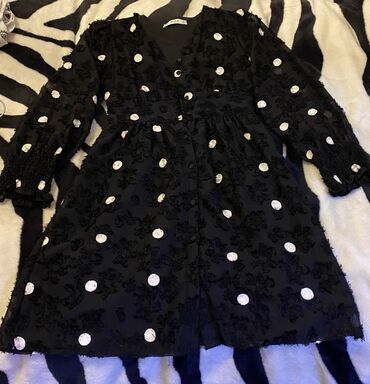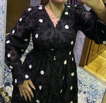 Uzun naxışlı maxi don - Rəng: qara-ağ - Naxış: həndəsi/kvadrat motivli all-over print - Model: uzun kollu, beldən yığma kəsim, geniş və axıcı ətək - Yaxa: V-yaxaya yaxın örtülü kəsim - Uzunluq: ay...