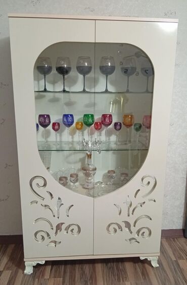 - Vitrin şkafı (iri): İkiqat şüşə qapı, içəridə üç səviyyəli şüşə rəf; ön paneldə dekorativ naxışlar; metal dekorlu tutacaqlar; stabil ayaqlar.