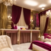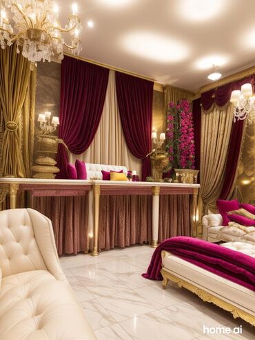 - Dekor: Qızılı aksesuarlar, kordon və bantlarla bağlama; klassik karnizlər və dekorativ tutulmalarla kombinasiya.