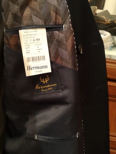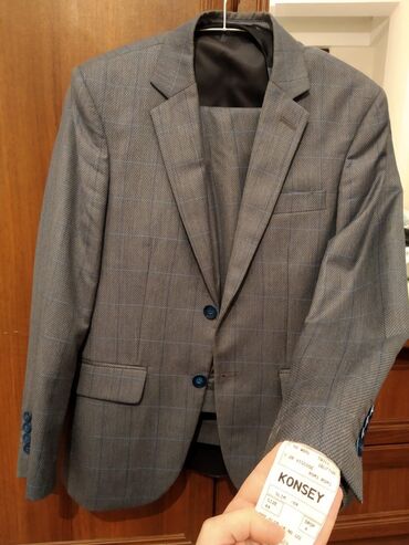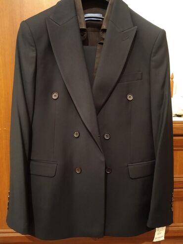 Geyim sifarişlə yeni alınıb gətirilib və sadəcə 44-0 ölçüsü uyğun gəlmədiyindən satılır. İki parçalı kişi kostyumu – qrafit boz rəngdə - Üst: ikicərgəli düymələmə, geniş haşiyəli (peak lapel) yaxa,...