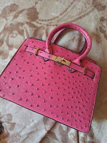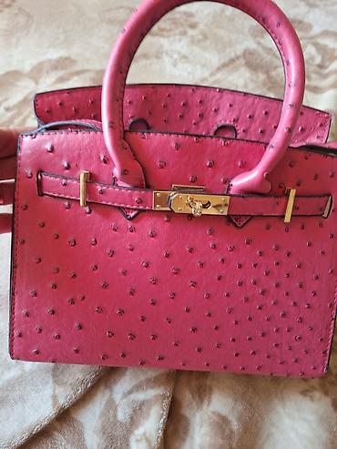 Qadın çantası – çəhrayı (fuksiya) rəngdə, quş dərisi teksturalı materialdan. Klassik mini/kiçik “top-handle” silueti, iki ədəd möhkəm üst qulpla. Ön hissədə qızılı rəngli metal bəzəklər və kilid el...