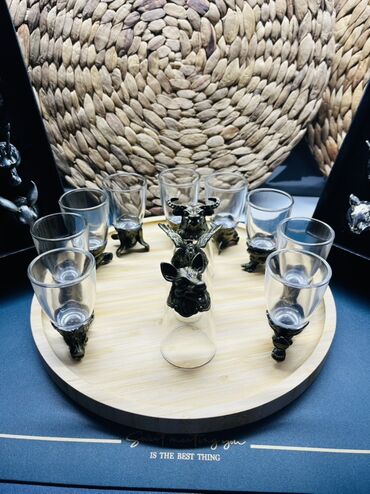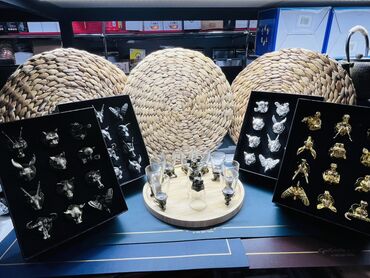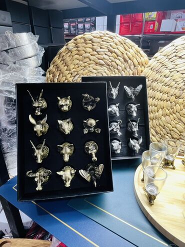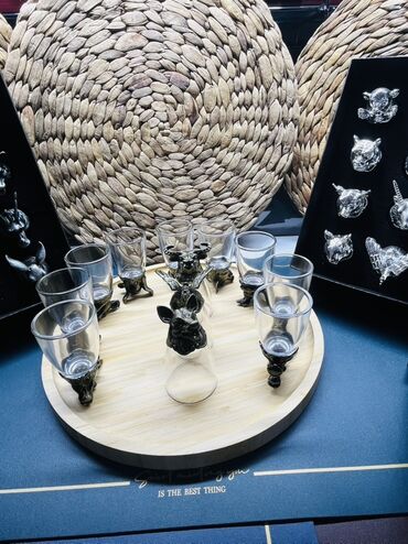 - Şüşə shot stəkanları, alt hissəsi metall heykəl başları ilə (maral, öküz, canavar, pələng, quş, kərtənkələ və s. müxtəlif heyvan motivləri).
