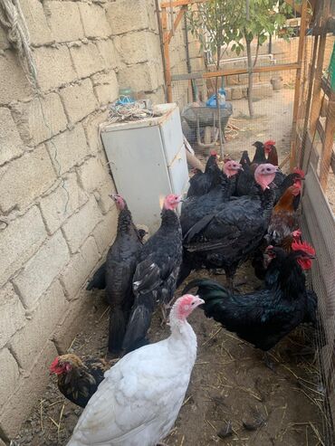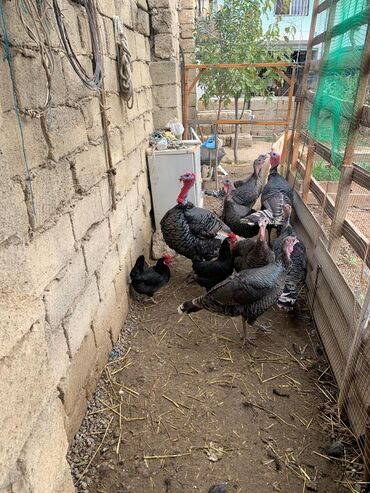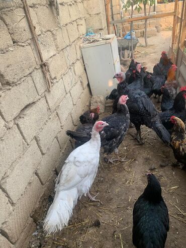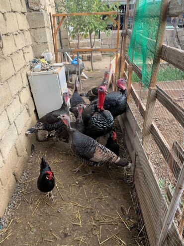 Şəkillərdə nə görünürsə, məhsul odur: müxtəlif rəng və ölçüdə hinduşkalar və toyuq/horozlar olan tam bir həyətyanı quş sürüsü.