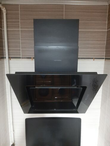 Mətbəx üçün divara quraşdırılan şüşə önlü aspirator (havalandırma qurğusu). - Rəng: qara, parlaq şüşə panel - Ön paneldə toxunma düymələri/idarəetmə zolağı - Alt hissədə 2 ədəd dairəvi LED işıqlan...