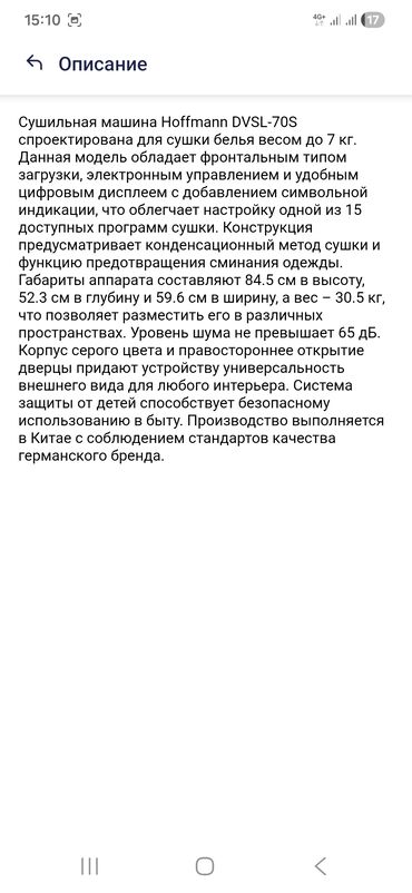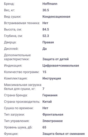 Kondensasion qurudma sistemi və 15 proqram sayəsində müxtəlif parçaları səmərəli qurudur. Elektron idarəetmə və rahat rəqəmsal displey sazlamanı asanlaşdırır. Qırışma əleyhinə rejim ütüləmə vaxtını azaldır. 65 dB səs səviyyəsi ilə sakit işləyir. Sağdan açılan qapılı, boz korpuslu universal dizayn istənilən məkana uyğun gəlir. Uşaqdan müdafiə funksiyası təhlükəsiz istifadəni təmin edir.