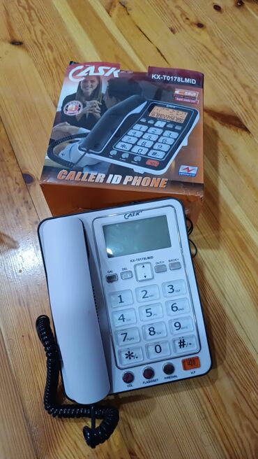 - Cask stasionar telefon, model KX-T0178LMID. Caller ID funksiyalı ekran, böyük və aydın rəqəm düymələri, səs səviyyəsi tənzimlənməsi (VOL), FLASH/SET, PREDIAL, H/F (hands-free) düymələri, yaddaş və geri zəng (BACK) idarələri. Qutu ilə.