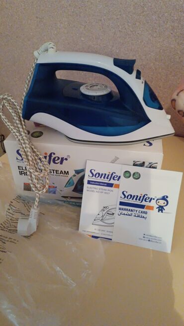 - Sonifer elektrik buxarlı ütü, model SF-9027. Qutu, təlimat və zəmanət kartı görünür. Temperatur tənzimlənməsi, buxar və su sprey düymələri, şaquli buxar üçün uyğun quruluş, şəbəkə kabeli.