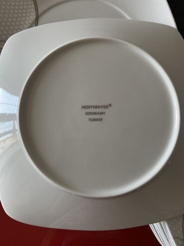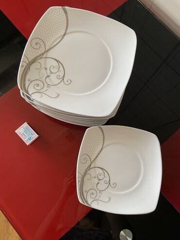 Kvadrat formalı porselen süfrə dəsti - Klassik ağ rəng üzərində kobalt-mavi və gümüşü naxışlı bəzək - Kvadrat və yumşaq künclü formalar: yemək boşqabları, dərin boşqablar/kasa tipli boşqablar və i...