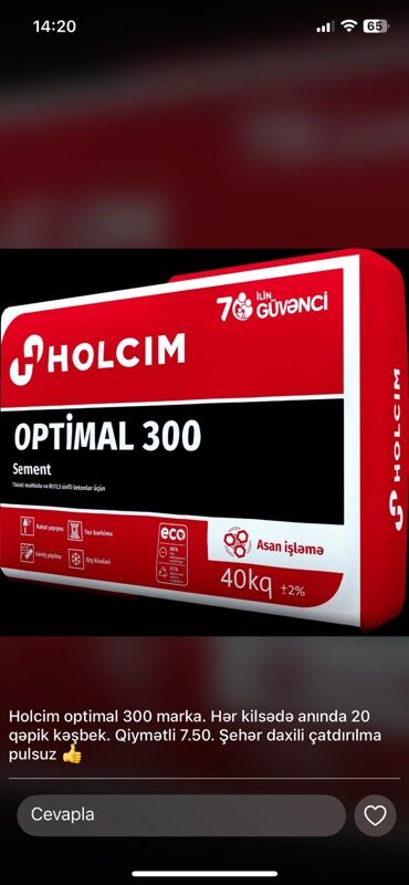 NORM Klass A 8.20 NORM Klass B 7.60 NORM Klass C 8.50 ÇATDIRILMA PULSUZ! Minimum 1polet (40 kisə) - Tətbiq sahələri: beton, suvaq, şap, bünövrə və ümumi tikinti qarışıqları - Yüksək möhkəmli...