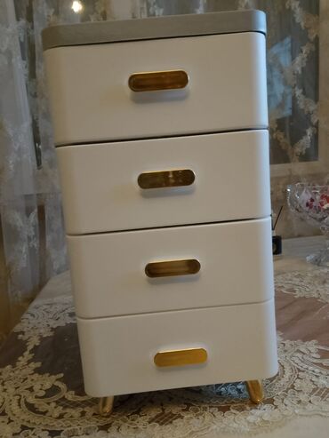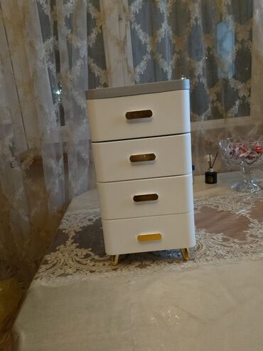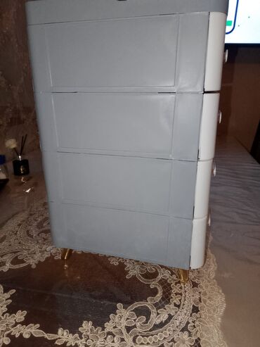 Dörd siyirtməli ağ rəngli komod. Bu komod paltarları, dəsmalları və ya digər əşyaları səliqəli şəkildə saxlamaq üçün əlverişlidir. Komodun yuxarı hissəsində və ayaqlarında dekorativ naxışlar mövcud...