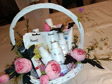 Ağ, dekorativ çiçəklərlə bəzədilmiş səbətdə Homm Life markasının müxtəlif dəriyə qulluq məhsulları toplanıb. Estetik görünüşü ilə bayram, ad günü və xüsusi günlər üçün hədiyyə kimi uyğundur.