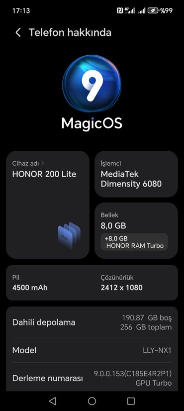 HONOR smartfon - Sistem: MagicOS 9.0 (Android 15) - Prosessor: MediaTek Dimensity 6080 - RAM: 8 GB + 8 GB HONOR RAM Turbo - Daxili yaddaş: 256 GB (təxminən 173.7 GB boş) - Ekran: 2412×1080 həlli, ...