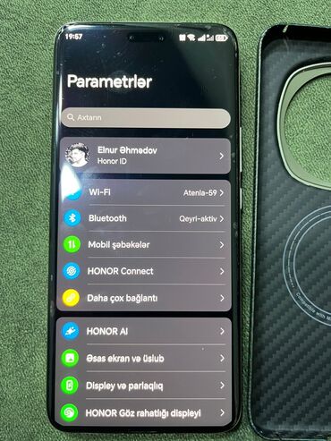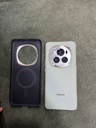 Honor smartfon – yaşıl rəng, arxa tərəfi teksturalı dizayn. Arxa kameralar kvadrat modulda 3 linza + flaş yerləşimi ilə. Arxa hissədə maqnitli dairəvi plaka (MagSafe tərzi tutucu/maunt üçün) quraşd...Razılaşma yolu ilə