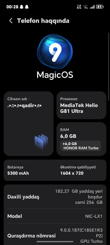 256 yaddaş 8+8 turbo ram saniyeyle şarj olma özeliyi telefonda cuzi endirim olunacax heçbir prablemi yoxdu telefon çox isdifade olunmuyub HONOR smartfon Xüsusiyyətlər: - Arxa paneldə dairəvi “Mat...