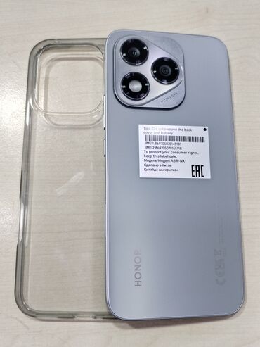 HONOR smartfon – model kodu ABR-NX1 (etiketdə qeyd olunub), EAC sertifikatlı. Gümüşü rəngdə korpus, düz kənarlı dizayn. Şəkillərdə şəffaf silikon qoruyucu keysi də mövcuddur.
