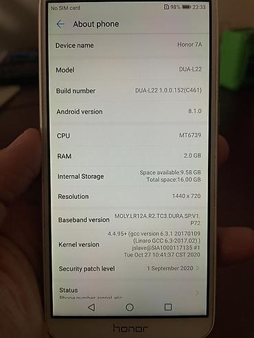 - Ekran: təxminən 5–5.5 düym tam ekran dizaynı, ön paneldə “Honor” loqosu