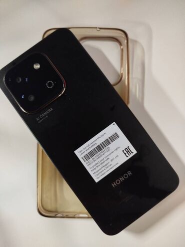 HONOR smartfon – qara rəngdə, zərif mat arxa qapaqla. Arxada kvadrat modulda üçlü kamera sistemi və LED işıq var; üzərində “AI Camera ASPH F1.8” qeyd olunur. Brend loqosu arxa hissədə. Xüsusiyyətl...