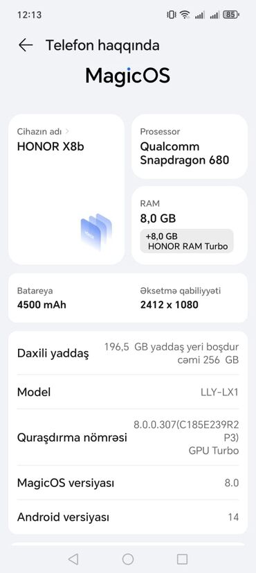 Geniş yaddaş, səmərəli Snapdragon 680 çipi və RAM Turbo sayəsində çoxtapşırıqlı istifadə üçün uyğun. 2412x1080 ekran gündəlik multimedia və sosial şəbəkələr üçün aydın görüntü verir. 4500 mAh batareya uzun istifadə imkanı təqdim edir. Kvadrat modulda çoxkameralı sistem foto və video çəkilişlər üçün əlverişlidir. MagicOS 8.0 (Android 14) müasir funksiyalar və təhlükəsizlik yenilikləri ilə gəlir.